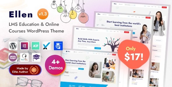 Ellen is a new modern WordPress theme purposely designed and built for Online Training and Education websites! It is perfectly suitable for educational institutes, online courses providers, online training, learning management, teacher, e-learning, instructor, kindergarten, tutor, lessons, online course, college, university, school, etc. The theme is created with Tutor LMS, Elementor, ACF Pro, Redux, Bootstrap, and CSS.