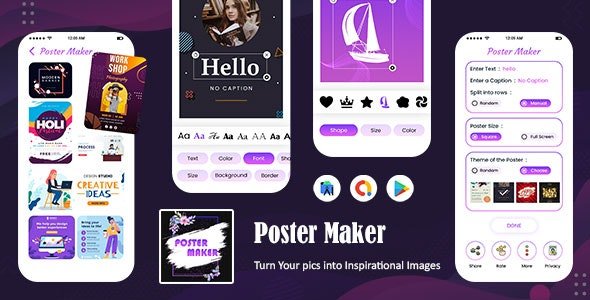 Poster Maker is an easy to use app, just select the background you like in the ratio as per your need and add your text with poster design fonts, add wonderful stickers (specially picked for poster making), add your pictures from gallery and create perfect poster every time.